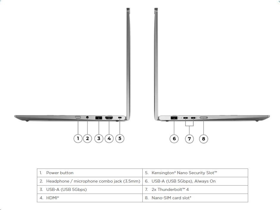 | Standartné porty | 1x USB-A (USB 5Gbps / USB 3.2 Gen 1) 1x USB-A (USB 5Gbps / USB 3.2 Gen 1), Always On 2x USB-C® (Thunderbolt™ 4 / USB4® 40Gbps), with USB PD 3.0 and DisplayPort™ 2.1 1x HDMI® 2.1, up to 4K/60Hz 1x Headphone / microphone combo jack (3.5mm) |
