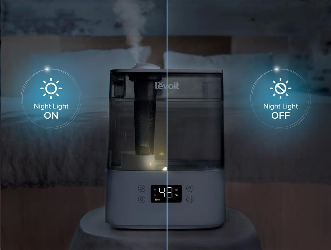 Zvlhčovač vzduchu Levoit Classic300S Smart lze ovládat přímo na přehledném podsvíceném LED displeji nebo také přes aplikaci na chytrých zařízeních Apple nebo Android. Nebo si ho můžete dokonce připojit do svého Smart Home a ovládat hlasem přes Google Assistant nebo Amazon Alexa. Senzor vlhkosti zobrazuje vlhkost v reálném čase a v automatickém režimu tak okamžitě reaguje na změny vlhkosti. Vždy by se mělo jednat o rozmezí mezi 40 % až 60 %. Přes aplikaci si můžete informace kontrolovat nebo si své režimy plánovat.