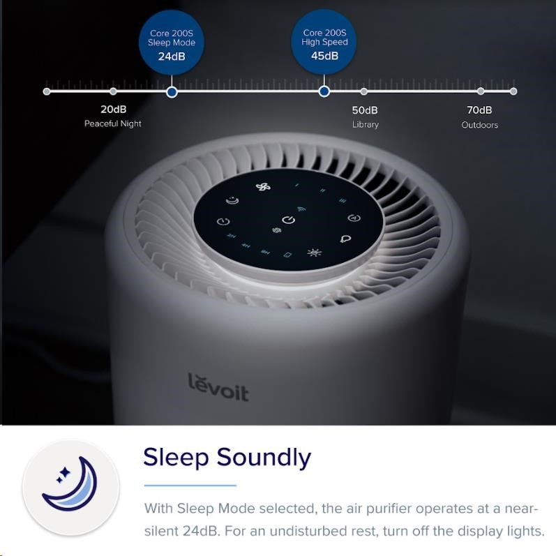 Díky patentované technologii QuietKEAPTM ani nebudete vědet, že je čistička Levoit Core 200S v provozu. Při nejvyšším výkonu dosahuje již tak nízké hlučnosti 45dB. Pro nerušený spánek se přímo nabízí noční režim, v kterým je hlučnost ještě nižší – 24 dB. V nočním režimu se také aktivuje tlumené osvětlení a můžete si vypnout podsvícení ikonek.