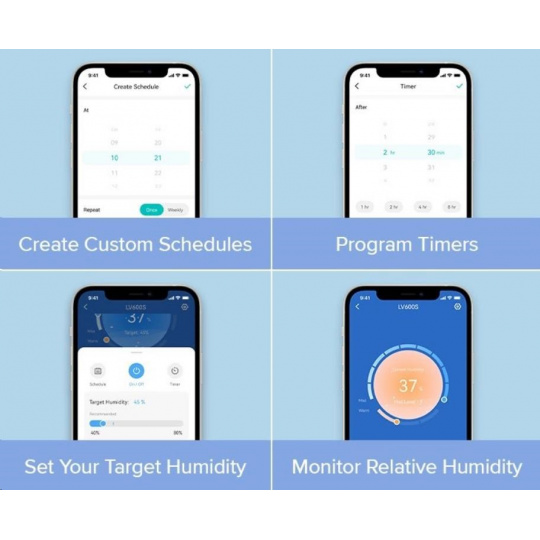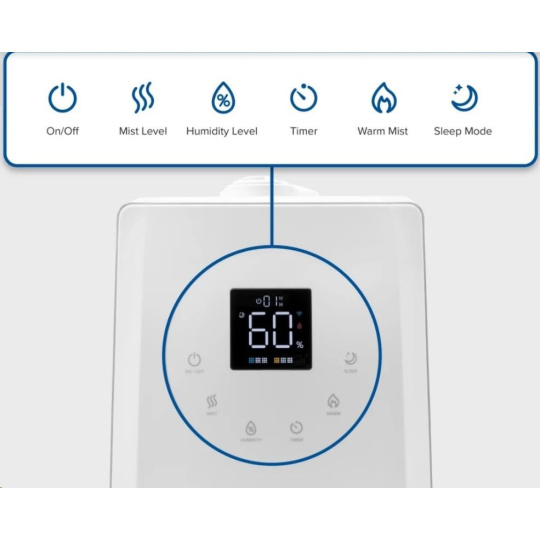 Zvlhčovač vzduchu Levoit LV600S Smart lze ovládat přímo na přehledném podsvíceném LED displeji nebo také přes aplikaci na chytrých zařízeních Apple nebo Android. Nebo si ho můžete dokonce připojit do svého Smart Home a ovládat hlasem přes Google Assistant nebo Amazon Alexa. Senzor vlhkosti zobrazuje vlhkost v reálném čase a v automatickém režimu tak okamžitě reaguje na změny vlhkosti. Vždy by se mělo jednat o rozmezí mezi 40 % až 60 %. Přes aplikaci si můžete informace kontrolovat nebo si své režimy plánovat.