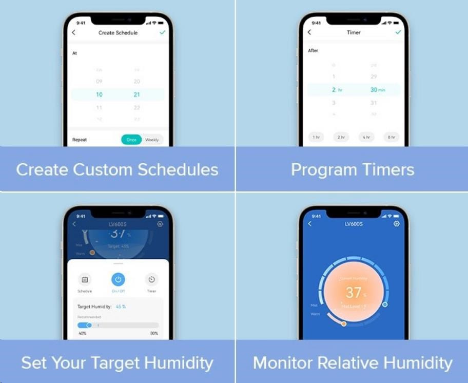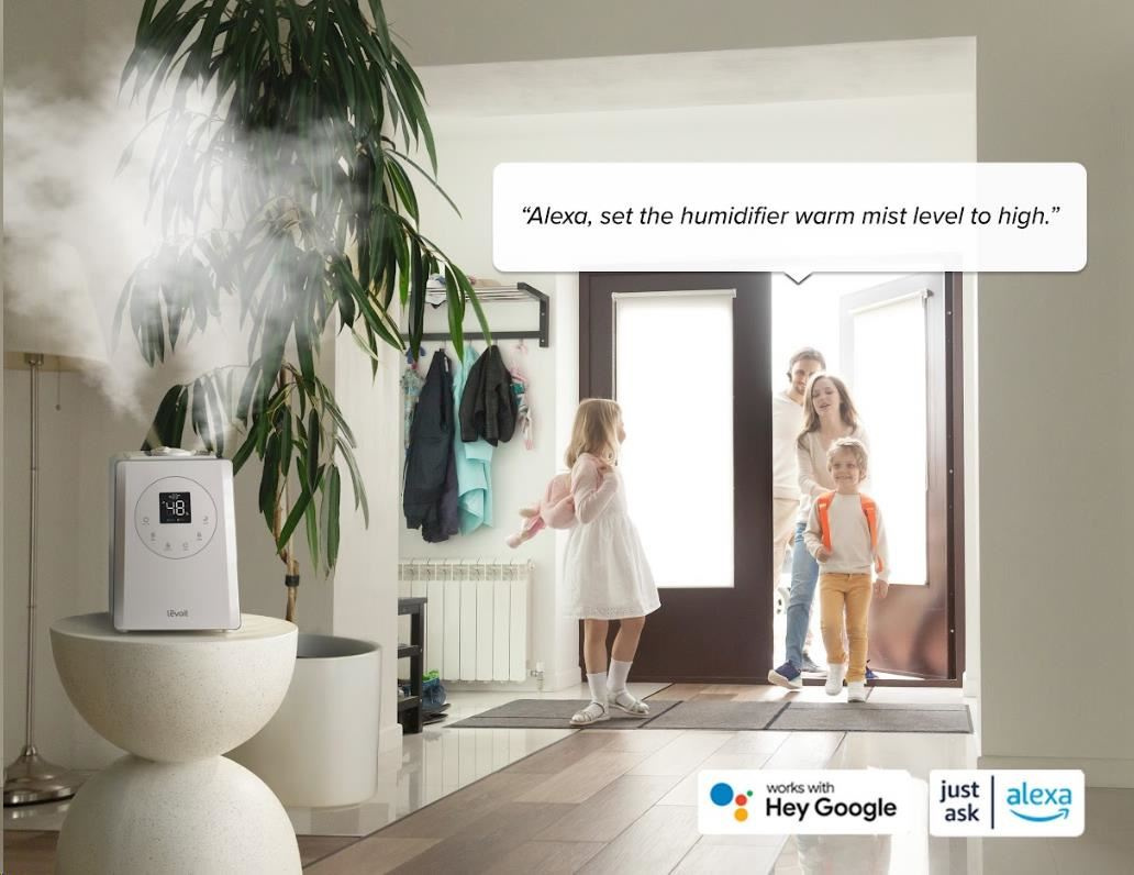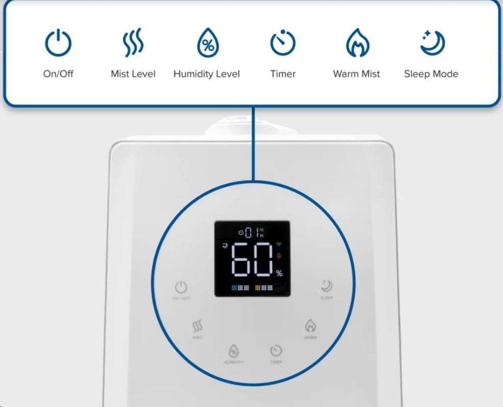 Zvlhčovač vzduchu Levoit LV600S Smart lze ovládat přímo na přehledném podsvíceném LED displeji nebo také přes aplikaci na chytrých zařízeních Apple nebo Android. Nebo si ho můžete dokonce připojit do svého Smart Home a ovládat hlasem přes Google Assistant nebo Amazon Alexa. Senzor vlhkosti zobrazuje vlhkost v reálném čase a v automatickém režimu tak okamžitě reaguje na změny vlhkosti. Vždy by se mělo jednat o rozmezí mezi 40 % až 60 %. Přes aplikaci si můžete informace kontrolovat nebo si své režimy plánovat.