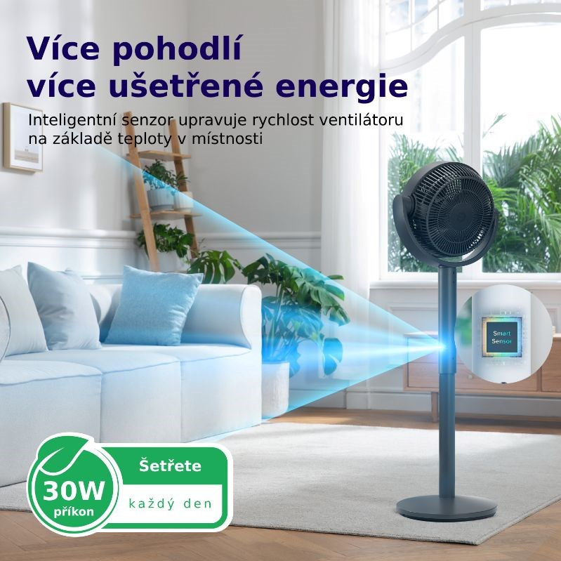 Stojanový ventilátor Levoit je vybaven teplotním senzorem, který automaticky reguluje výkon podle aktuální teploty v místnosti, čímž zajišťuje optimální komfort. S nízkou spotřebou pouze 28 W je tento ventilátor energeticky úsporným řešením pro každodenní používání. Navíc nabízí 12 rychlostí, které umožňují plynulý chod bez náhlých přechodů, takže si můžete snadno nastavit ideální úroveň chlazení podle svých potřeb.
