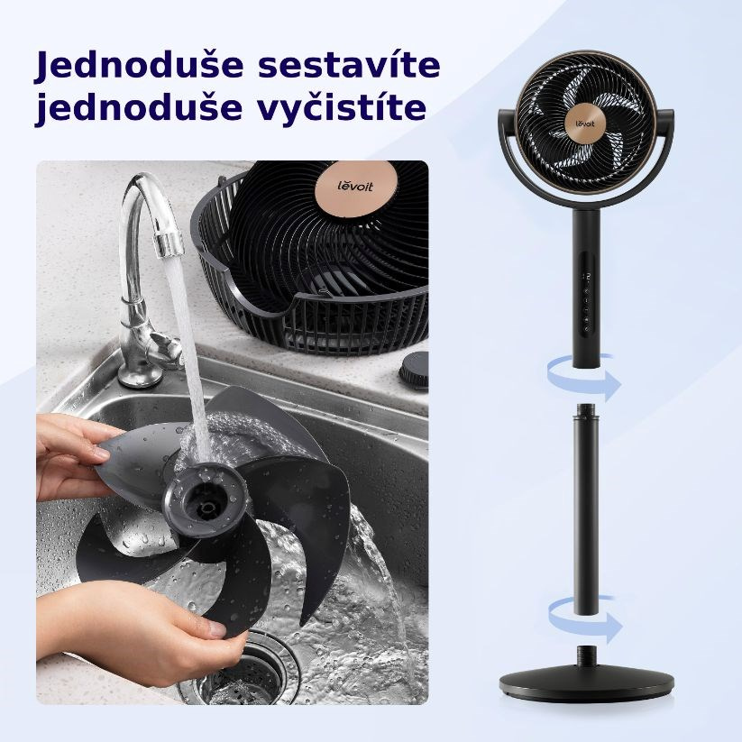 Stojanový ventilátor Levoit se vyznačuje jednoduchým sestavením bez potřeby jakéhokoli nářadí, což vám ušetří čas a námahu. Je navržen tak, aby se dal snadno rozebrat a umýt vodou, což zajišťuje hygienické prostředí a minimalizuje víření prachu v místnosti. Díky této praktické údržbě si můžete užívat čistý a svěží vzduch bez zbytečných starostí.