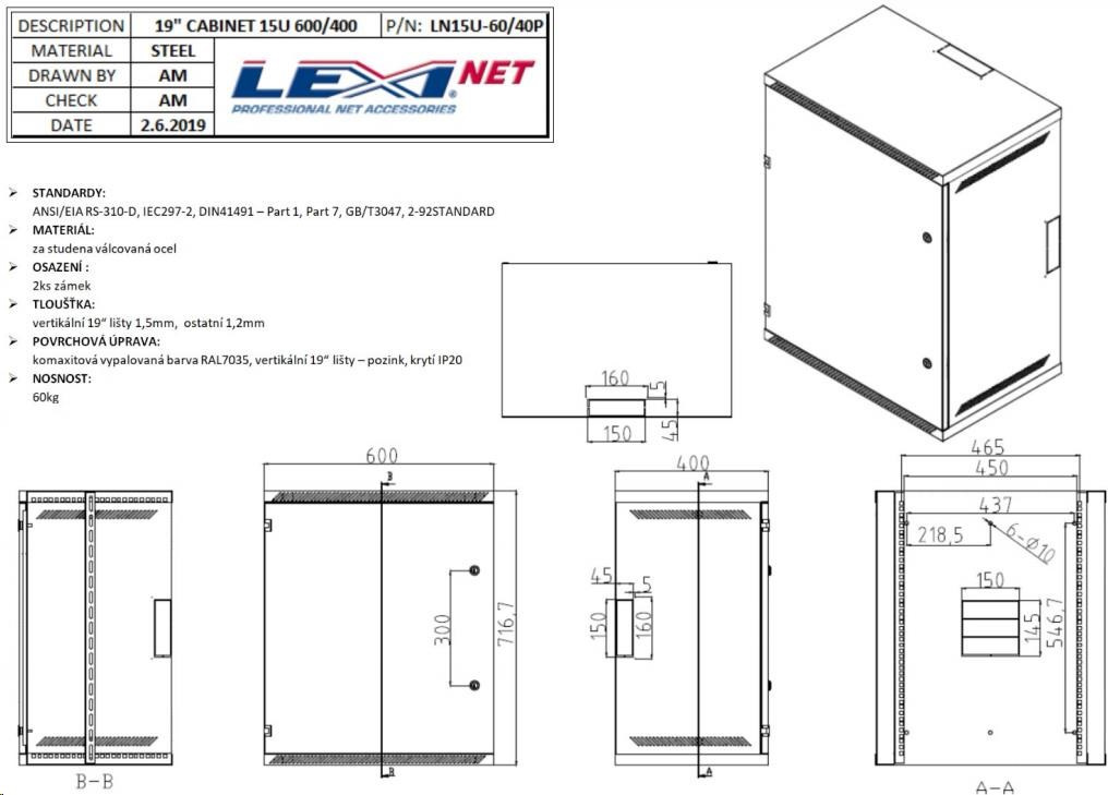 | Povrchová úprava: | komaxitová vypalovaná barva RAL7035 - šedá vertikální 19" lišty - pozink |
