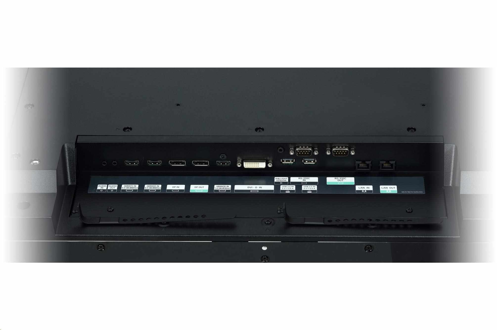 Brightness(Typ.) : 500 cd/m2 Aspect Ratio: 58:9 Bezel: 4.4 mm(L/R), 5.9 mm(T/B) Depth: 81.7mm Interface: HDMI (3), DP, USB(2), Audio, DVI-D, RS232C, RJ45, IR.