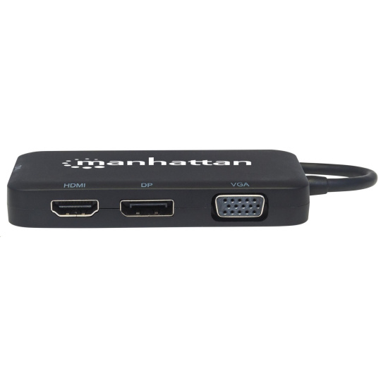 The Manhattan USB-C 4-in-1 Audio/Video Converter establishes a fast, simple and convenient link between newer USB Type-C equipped media sources (computers, tablets, Smartphones, etc.) and existing HDMI, DisplayPort, VGA or DVI displays (monitors, projectors, etc.). The Manhattan USB-C 4-in-1 Audio/Video Converter is easy and quick to install — no complicated configuration or setup required. Its all-in-one design achieves a compact, integrated solution that eliminates unnecessary cables, tangles and clutter to keep installations and workspaces neat and orderly. Extend the service life of your equipment, and fully realize the investment and value of your HDMI, DP, VGA or DVI displays, projectors and peripherals with a Manhattan USB-C 4-in-1 Audio/Video Converter.