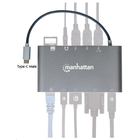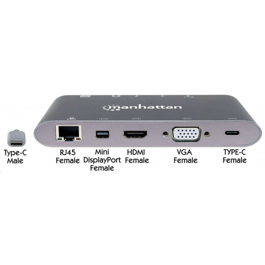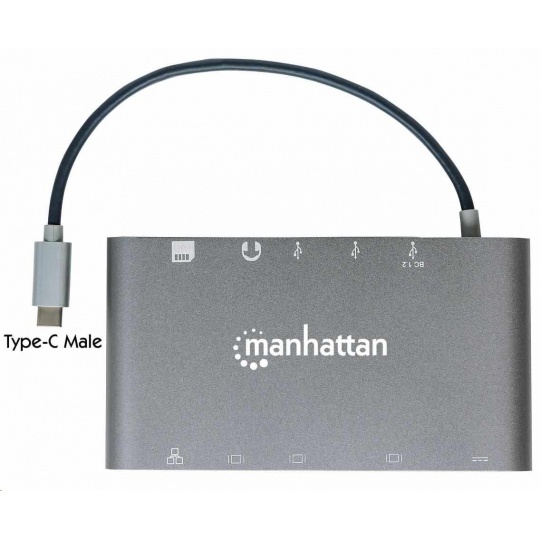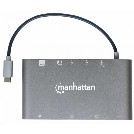 MANHATTAN Dokovací stanice USB-C 7v1, 1xHDMI, 1xVGA, 1xUSB-C,3xUSB, 1xRJ45, 1x3.5mm, šedá