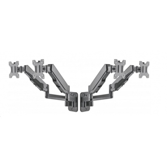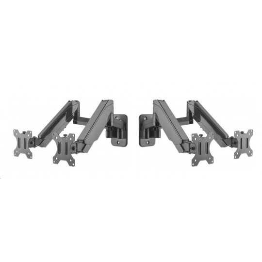 This Manhattan Universal Gas Spring Dual Monitor Wall Mount offers two jointed gas-spring arms that securely hold two 17" to 32" TV or monitors. This mount's gas springs promote easy movement of the monitors or TVs to a more comfortable viewing angle with the lightest touch. Designed to give back much needed desktop real estate and maximize productivity, the Manhattan Universal Gas Spring Dual Monitor Wall Mount provides more flexibility, reach, and overall enjoyment of whatever task is at hand.