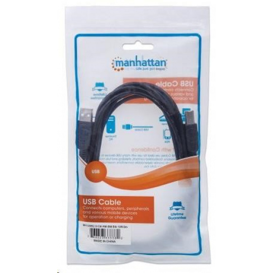 Manhattan Hi-Speed USB 2.0 Device Cables easily connect USB peripherals and accessories with desktop and notebook computers. Ideal for use with many USB external enclosures, hubs and other hot-swap, plug-and-play devices, Manhattan Hi-Speed USB 2.0 Device Cables support data transfer rates up to 480 Mbps on Windows and Mac systems for fast, reliable transmissions. Gold-plated contacts, shielding and fully molded boots with strain relief help provide dependable connections, maximum conductivity and minimal data loss with reduced EMI interference.