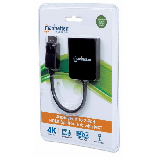 Full compliance with DisplayPort, HDCP 2.2 and DVI 1.0 ensures that the Manhattan DisplayPort to Dual HDMI - MST Hub can provide long service and reliable performance. Quickly connect HDMI cables (not included) and the included USB power cable, and this affordable, Ultra-High-Definition 4K DisplayPort/HDMI solution is complete — no software/hardware configuration or complicated settings required.