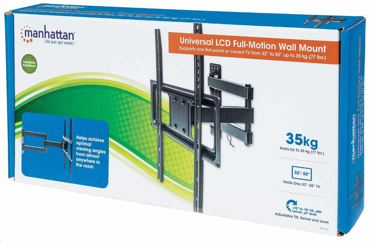 Overcome odd floor plans, annoying glare and awkward furniture placements that can diminish flat-panel TV experiences. Manhattan Universal Flat-Panel TV Full-Motion Wall Mounts help achieve optimal viewing angles from almost anywhere in the room with precise adjustments that keep images, contrasts and colors clear, sharp and defined. VESA-compliant and constructed of quality materials, Manhattan Universal Flat-Panel TV Full-Motion Wall Mounts fit a range of display sizes with a secure and confident above-the-floor installation. Ideal for residential, office, hospitality, classroom and conference room, digital signage and other commercial applications, Manhattan Universal Flat-Panel TV Full-Motion Wall Mounts bring high-performance LCD or plasma TV enjoyment front and center.