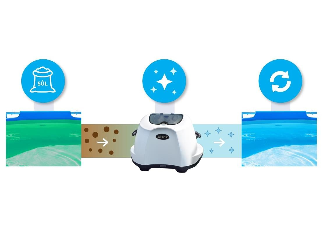 Spuštěním filtrace slaná voda prochází skrz chlorinátor, který přetváří rozpuštěnou sůl na chlór. Vzniklý chlór okamžitě dezinfikuje vodu.