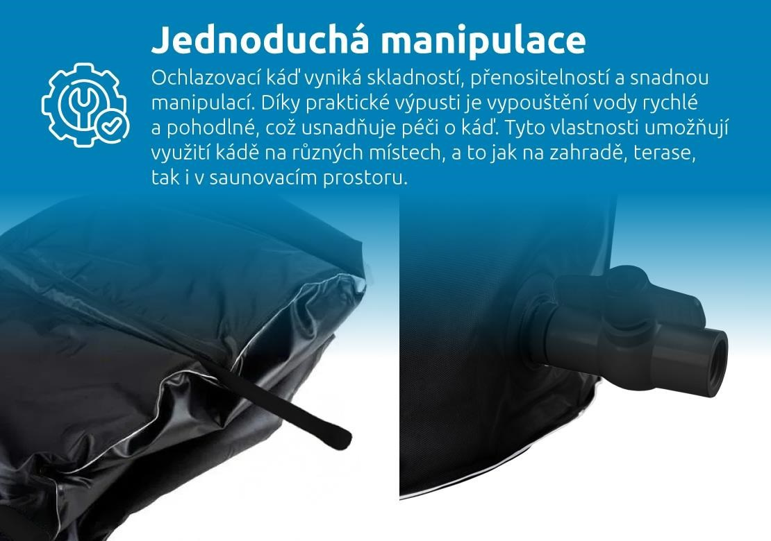 Snadno přenosná káď s praktickou výpustí usnadňuje péči i manipulaci. Odolný kryt chrání obsah před nečistotami a prodlužuje životnost kádě. Káď lze v okamžiku složit a uskladnit.