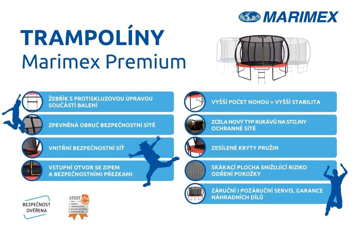 Trampolíny Marimex Premium nevynikají pouze novým designem a barevností, ale také větší stabilitou, pevností a bezpečností. Zvýšené stability trampolín Marimex Premium je dosaženo pomocí vyššího počtu nohou. Bezpečnost zajišťují zesílené ochranné kryty pružin a nová technologie T-spojů. Vnitřní ochrannou síť podpírá osm dynamicky prohnutých tyčí a napnutou ji drží zpevněná horní obruč. Skákací plocha je vyrobena z velmi odolného a neabrazivního materiálu s vysokou životností.