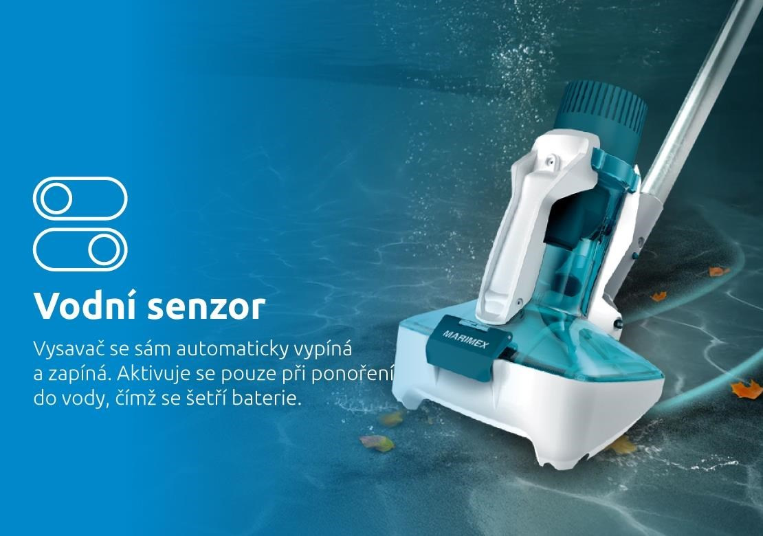 Vodní senzor zajistí automatické zapínání a vypínání při ponoření do vody, čímž se šetří baterie vysavače. LED indikátor navíc upozorní na nízkou kapacitu baterie. Bezpečnostní mechanismus dokáže zastavit čepele, pokud dojde k ucpání vysavače, což zajišťuje bezpečný a bezproblémový provoz.