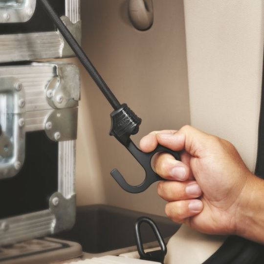 Speciální upínací guma s délkou 800 mm o průměru 8 mm zakončená háčkem a okem. Maximální nosnost 65 kg. Ploché ocelové háčky vybavené okem pro snadnější manipulaci a vyšší pevnost v tahu. Plastem kryté háčky zabraňující poškození nákladu.