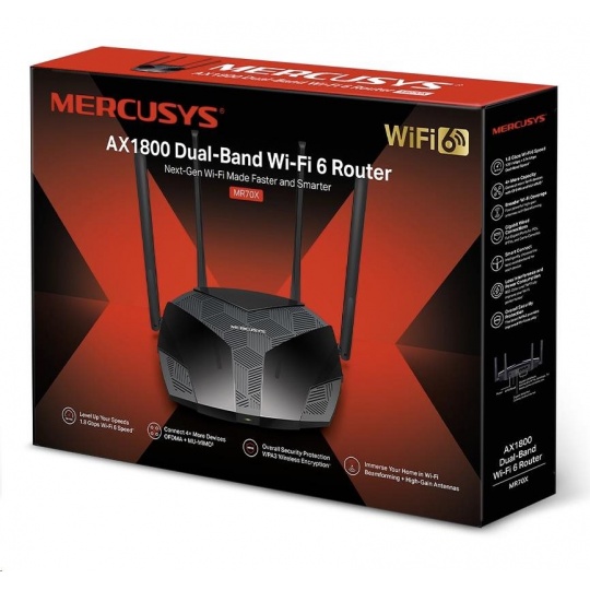 | Package Contents | • AX1800 Wi-Fi 6 Router MR70X • Power Adapter • Quick Installation Guide • RJ45 Ethernet Cable |