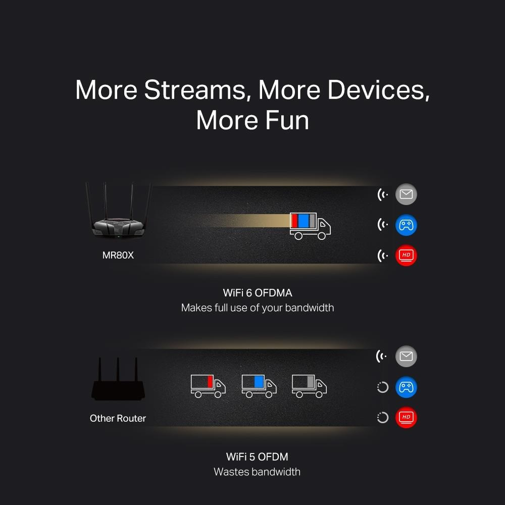 - Více zařízení, více zábavy – podporuje technologie MU-MIMO a OFDMA, které snižují zahlcení sítě a čtyřnásobně zvyšují průměrnou propustnost.