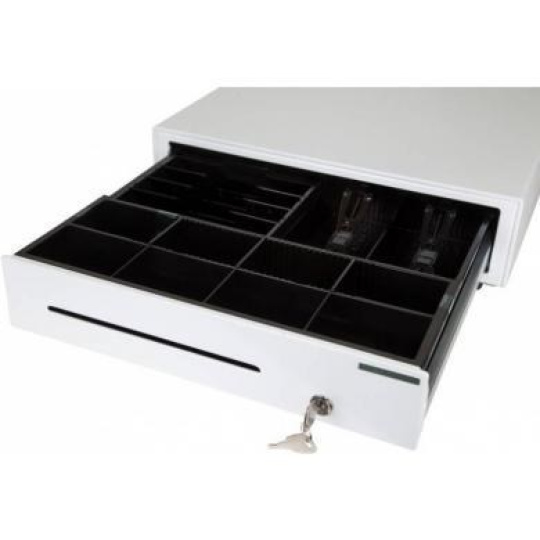 cash drawer, front opening, dimensions (WxHxD): 410x114x415mm, insert: 6 note compartments, 8 coin compartments, 1 receipt compartment, direct printer connection, RJ12, colour: white.