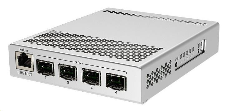 CRS305-1G-4S+IN je kompaktní, přesto velmi výkonný switch, který má čtyři SFP+ porty s rychlostí 10 Gbps/port. Zařízení má také kromě optických portů i jeden Gigabitový ethernet s podporou POE IN pro snadný přístup k zařízení, konfiguraci zařízení nebo jako převod na metalické vedení. K napájení slouží hned dva DC konektory pro redundanci napájení. Switch je velmi elegantní, kompaktní a jeho kovové pouzdro bez ventilátorů zajišťuje tichý provoz.