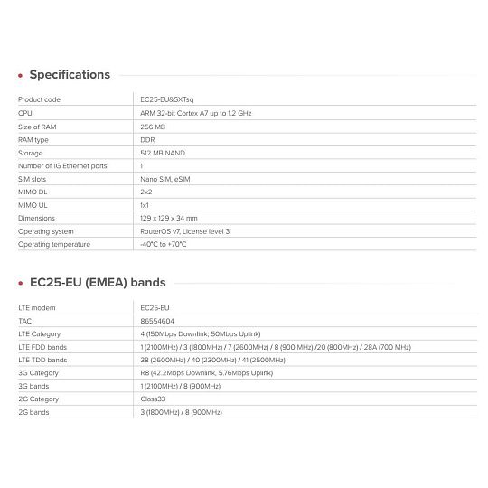 Cenově výhodné venkovní LTE zařízení s integrovanou směrovou anténou 2×2 MIMO. Mikrotik nabízí řešení pro spolehlivý a cenově dostupný způsob, jak se připojit k internetu. Global edice modelu SXTsq Embedded LTE4 (doplněn o další LTE pásma pro USA a oblasti mimo region EMEA) Zařízení SXTsq Embedded LTE4 je navrženo pro praktické připojení v domácnostech na venkově, chatách, staveništích a podobně odlehlých místech. Jednoduše externě nainstalujte, nasměrujte na nejbližší vysílač a získejte spolehlivé LTE připojení. Integrovaná směrová anténa zlepšuje kvalitu a stabilitu signálu. SXTsq Embedded LTE4 je vybaven modemem Cat4 LTE, integrovanou směrovou anténou 2×2 MIMO, rychlým procesorem ARM, 256 MB RAM. Disponuje vstupem PoE (12–57 V) a odolným krytem s krytím IP67 – vše s operačním systémem RouterOS v7 a max. spotřebou pouhých 5 W. Zařízení obsahující operační systém RouterOS v7 nabízí kompletní síťový konfigurační komfort včetně: • pokročilé směrování • podporu firewallu a VPN • vzdálenou správu • řízení a monitorování provozu • automatizaci a skriptování eSIM + Nano SIM – ještě jednodušší připojení Zařízení SXTsq Embedded LTE4 přináší podporu eSIM do této oblíbené platformy pro venkovní použití. Aktivujte datový tarif na dálku a připojte zařízení k internetu bez nutnosti manipulace s fyzickými SIM kartami. To je užitečné zejména při vzdálených nasazeních, záložních připojeních a rozptýlených instalacích. Pro větší flexibilitu je zařízení vybaveno také slotem pro Nano SIM, což vám v případě potřeby umožní využívat služeb tradičních mobilních operátorů. Rychlé nasazení, flexibilní připojení – přesně to, co moderní sítě vyžadují. SXTsq Embedded LTE4 Global (EG25-G) Rozšířená podpora LTE pásem pro Severní Ameriku a globální nasazení, díky čemuž je zařízení vhodné pro mezinárodní projekty a instalace ve více regionech. Technické specifikace Product code: EC25-EU&SXTsq CPU: ARM 32-bit Cortex A7 up to 1.2 GHz Size of RAM: 256 MB RAM type: DDR Storage: 512 MB NAND Number of 1G Ethernet ports: 1 SIM slots: Nano SIM, eSIM MIMO DL: 2x2 MIMO UL: 1x1 Dimensions: 129 x 129 x 34 mm Operating system: RouterOS v7, License level 3 Operating temperature: -40°C to +70°C Podporovaná pásma: LTE modem: EG25-G TAC: 01678800 LTE Category: 4 (150Mbps Downlink, 50Mbps Uplink) LTE FDD bands: 1 (2100 MHz)/ 2 (1900MHz) / 3 (1800 MHz) / 4 (1700MHz) / 5 (850 MHz) / 7 (2600 MHz) / 8 (900 MHz) / 12 (700MHz) / 13 (700 MHz) / 18 (800 MHz / 19 (800 MHz / 20 (800 MHz) / 25 (1900MHz) / 26 (850MHz) / 28 (700MHz) LTE TDD bands: 38 (2600MHz) / 39 (1900MHz) / 40 (2300MHz) / 41 (2500MHz) 3G Category: R8 (42.2Mbps Downlink, 5.76Mbps Uplink) 3G bands: 1 (2100MHz) / 2 (1900MHz) / 4 (1700MHz) / 5 (850MHz) / 6 (850 MHz) / 8 (900MHz) / 19 (800 MHz) 2G Category: Class33 2G bands: 2 (1900MHz) / 3 (1800MHz) / 5 (850MHz) / 8 (900MHz) Napájení: DC input: PoE-In PoE-In input Voltage: 12-57 V Power adapter nominal voltage: 24 V Power adapter nominal current: 0.38 A PoE-in: 802.3af/at Max power consumption: 5 W Upozornění: Výrobce Mikrotik neposkytuje záruku na zařízení poškozená přepětím. Zařízení je třeba adekvátně chránit proti indukovanému elektrostatickému přepětí či přepěťovým špičkám na silovém vedení. Pro venkovní instalace používat výhradně stíněnou kabeláž (FTP/SFTP) a jednotky korektně uzemnit (prostřednictvím integrovaného zemnícího členu či použitím ethernetové přepěťové ochrany)..