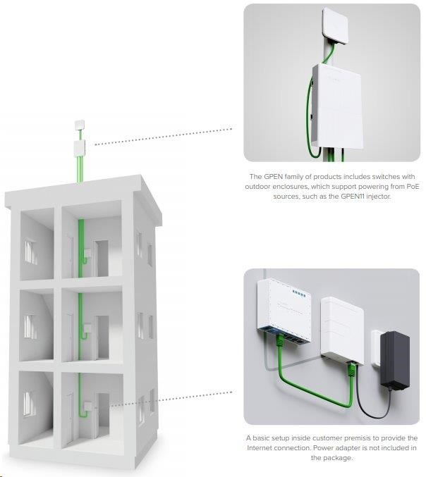 GPEN11 je POE injektor s dvěma gigabitovými ethernet porty určený k montáži na zeď, pomocí kterého můžete napájet zařízení určené pro příjem nebo distribuci konektivity v místě instalace. Výstupní napětí je stejné jako vstupní, v rozmezí 12-57V.