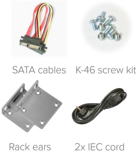 Balení obsahuje: RB1100AHx4 v hliníkovém krytu do 1U, integrovaný napájecí zdroj, 2x napájecí kabel, SATA kabel, M.2 SSD 60GB, úchyty do rozvaděče