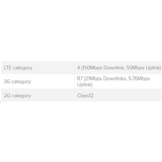 Popis produktu Nová revize úspěšného wAP LTE Kit modelu. Jedná se o malý access point ve venkovnímn provedení s možností umístění do interiéru pomocí podstavce, který je součástí balení. Uvnitř najdeme zabudovanou miniPCI-e LTE kartu EC200A-EU, která podporuje sítě 2G, 3G a 4G (LTE). Dále je wAP také vybaven zabudovanou 4 dBi GSM anténou pro připojení k mobilnímu operátorovi. Pro připojení domácích zařízení je k dispozici 2.4 GHz rádiová část s přenosovou rychlostí až 300 Mbps a pro kabelové zařízení využijete jeden 10/100 Mbps LAN port s podporou PoE. Klíčové vlastnosti 2.4 GHz Wi-Fi (802.11b/g/n) - až 300 Mbps 4G LTE kategorie 4 s rychlostí stahování a odesílání 150 Mbps / 50 Mbps (1) Nano SIM slot (1) 10/100 Mbps LAN Široké možnosti napájení: DC jack, PoE, Automotive konektor (4-pin) Podpora 2G, 3G i 4G LTE sítí Podpora LTE pásem: 1, 3, 5, 7, 8, 20, 28, 38, 40, 41 Obsah balení Zařízení s LTE kartou Napájecí adaptér 24V / 0.8A PoE injektor Sada šroubků a hmoždinek Kit k přichycení na zeď/strop Podstavec na stůl Automotive 4-pinový napájecí kabel Technické parametry Bezdrátové vlastnosti Bezdrátové frekvence:2.4 GHz, LTE WiFi standardy:802.11n, 802.11b/g Přenosová rychlost - 2.4GHz [Mb/s]:300 Vysílací výkon 2.4GHz [dBm]:25 2.4GHz MIMO:1 x 1 SISO Typ antény:Vestavěná Zisk antény [dBi]:2 Integrovaná 4G/LTE rádiová část:Ano Podporované 4G/LTE kanály:(1) 2100 MHz, (3) 1800 MHz, (7) 2600 MHz, (8) 900 MHz, (20) 800 MHz, (38) 2600 MHz, (40) 2300 MHz, (5) 850 MHz, (41) 2500 MHz, (28) 700 MHz Konektory a rozhraní Rychlost LAN:(1) 10/100Mbps Slot na SIM kartu:Ano Počet SIM slotů:1 Napájení Napájení přes PoE:9 .. 30V DC Typ napájení:DC konektor, PoE, 4-pin automotive Typy PoE:PoE-In (pouze) Max. spotřeba energie [W]:7 Napájení přes konektor/svorkovnici:9 .. 30V DC Fyzické charakteristiky Provedení:Venkovní, Na zeď, Na stožár, Desktop, Stropní Použití:Venkovní Provozní teplota [°C]:-40 až 60 Šířka [mm]:85 Výška [mm]:185 Hloubka [mm]:30 Hardware CPU:QCA9531 Počet CPU jader:1 Interní uložiště [MB]:16 RAM [MB]:64 Software Operační mód:Klient, AP Router, Access Point, Klient Router (wisp), 3G/4G Router Operační systém:RouterOS - L4 Podpora IPv6:Ano Výchozí IP adresa:192.168.88.1 Výchozí jméno a heslo:admin / -.