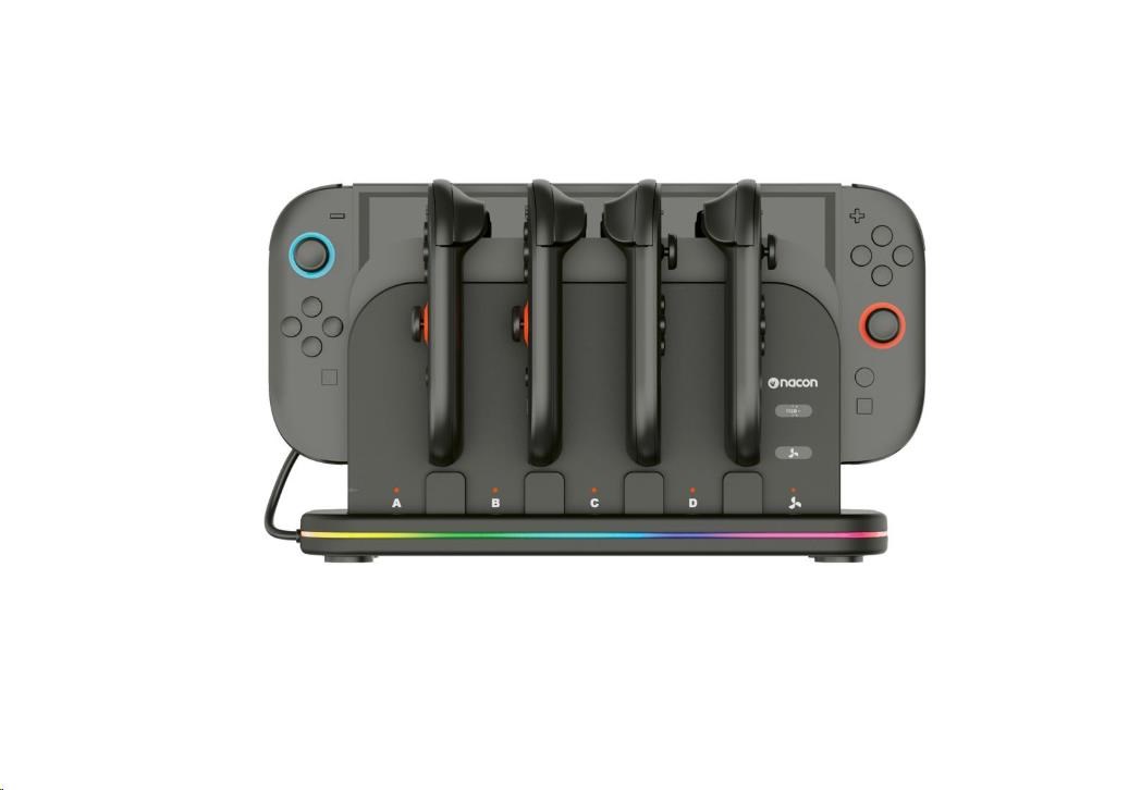 Tato nabíjecí dokovací stanice od společnosti Nacon přijde vhod všem majitelům nové herní konzole Nintendo Switch 2 i původní herní konzole Nintendo Switch, kteří často potřebují nabíjet větší počet ovladačů Joy-Con. Stanice umožňuje nabíjet současně až čtyři ovladače, jakož i samotnou konzoli, jejímuž přehřátí zabraňuje zabudovaný chladicí větráček. O stavu nabíjení každého z ovladačů informuje příslušný LED ukazatel, zatímco RGB proužek s výběrem z devíti různých efektů dodává stanici stylový, moderní vzhled. Protože napájecí USB-C kabel není součástí balení, slouží k připojení stanice do elektrické sítě originální napájecí příslušenství dodávané s konzolí.