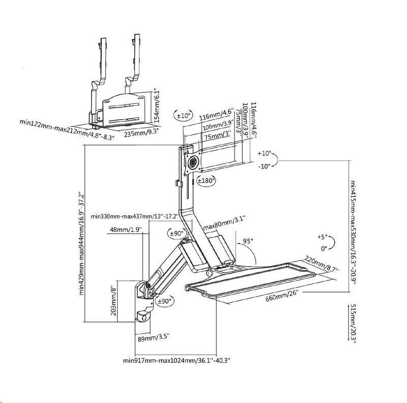 Nástěnná pracovní stanice monitor, klávesnice, PC Fiber Mounts M8C38 Kompletní pracovní stanice, držák monitoru 17-32", klávesnice a PC Toweru Kvalitní nástěnný systém pro vytvoření pracovní nebo informační stanice - 3D polohovatelný držák na monitory 17-32" včetně poličky na klávesnici i s myší + univerzální nástěnný držák na PC Tower. Plná polohovatelnost držáku monitoru s policí - otáčení, naklápění, výškové polohování, rotace monitoru, korekce roviny, možnost zaklopení police. Police na klávesnici (a myš) má rozměr 660 x 220mm, možnost naklopení nebo zaklopení. Na držáku je i přihrádka na vizitky, katalogy apod. Nástěnný držák na PC Tower má nosnost 15kg. Barevné provedení černé. Záruka 3 roky. Plnohodnotná nástěnná pracovní stanice na monitor, klávesnici s myší a PC Tower, plně polohovatelné, TOP kvalita - Fiber Mounts M8C38 Technické údaje: maximální hmotnost monitoru 9kg maximální hmotnost PC Toweru 15kg velikost monitoru 17" až 32" držák monitoru podporuje VESA 75x75 a 100x100 kompletní polohovatelnost držáku monitoru s policí otáčení do stran, naklápění, nastavení výšky a vzdálenosti od zdi výškové polohování až o 515mm funkce pivot držáku monitoru police na klávesnici o rozměrech 660x220mm možnost náklonu až 5°, možnost zaklopení k monitoru nástěnný držák na PC Tower včetně popruhů instalační materiál systém vedení kabeláže barevné provedení černé záruka 3 roky.