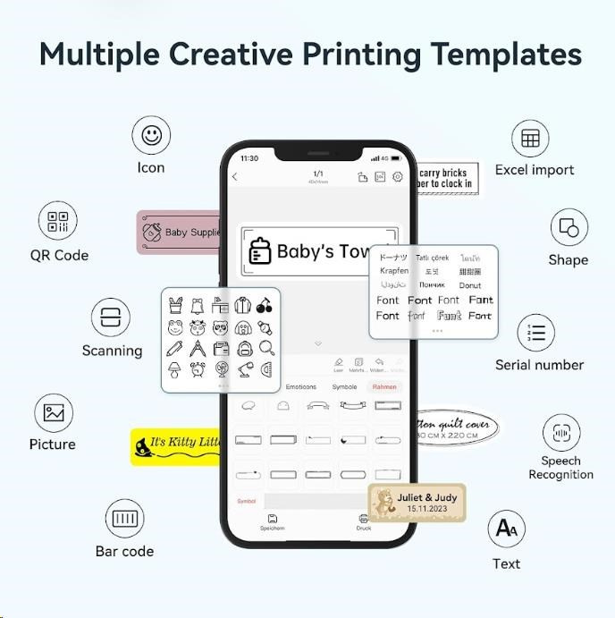 Při navrhování štítku můžete použít různá písma, tvary, ikony, velikosti a formáty, abyste si vytiskli etikety nebo štítky podle své představy. Můžete importovat fotografie z vašeho telefonu nebo obrázky z internetu, aby byl design jedinečnější. Bezplatná aplikace pro iOS nebo Android nabízí více než 1500 ikonek, více než 100 rámečků, 19 fontů písma a umožňuje také tisk QR kódů. Můžete si vybrat z různých stylů písma, velikostí a formátů, abyste si vytiskli etikety nebo štítky přesně podle své představy. Tiskárna automaticky rozezná vložené etikety a aplikace přizpůsobí rozměry pro tisk.
