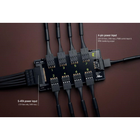 NA-FH1 je vysoce kvalitní, chytře chráněný 8kanálový rozbočovač ventilátorů PWM, který umožňuje spustit a ovládat až osm ventilátorů PWM současně prostřednictvím jediné hlavičky ventilátoru PWM na základní desce nebo samostatných regulátorů, jako je volitelný NA-FC1. Ventilátory bez PWM lze ovládat nastavením vstupního napětí. Díky podpoře 12V i 5V ventilátorů se 4pólovými PWM a 3pólovými konektory je NA-FH1 vysoce flexibilní a vhodný jak pro prostředí PC, tak pro další aplikace založené na 12V nebo 5V. Může být napájen buď přes vstup S-ATA (pro 12V ventilátory, až 54 W), nebo přes 4pinový vstup PWM (pro 5V a 12V ventilátory, až 24 W), přičemž oba jsou chráněny proti nadproudu samonastavovací pojistkou pro maximální bezpečnost i v případě zkratu na připojených zařízeních nebo kabelech.