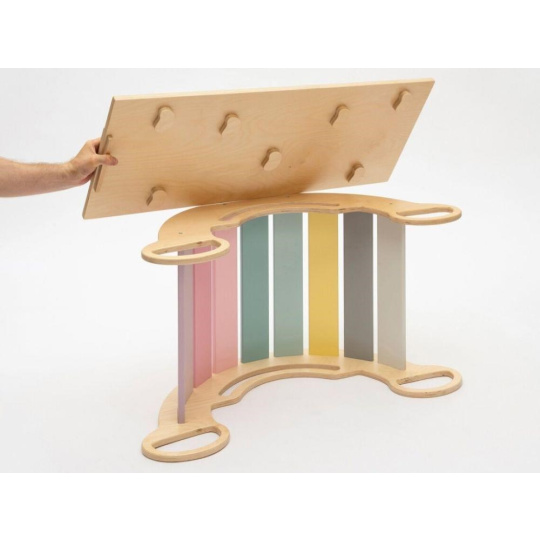 Kvalitní dřevěné oboustranné prkno (pouze k houpačce SMILE) má všestranné využití. Z jedné strany zábavná skluzavka, po které se děti sklouznou třeba na měkkou žíněnku, na druhé straně lezecká deska s úchyty, která rozvíjí pohybové dovednosti vaší holčičky i chlapce. Oboustranná deska je doplňkem k Montessori houpačce SMILE. Položená na boční hraně houpačky smile vytvoří dětem praktický stoleček ke svačince i k malování. Oboustranné prkno není možné používat s Montessori houpačkami 5in1 ELIS DESIGN. Prkno je širší než naše duhové a dřevěné houpačky. PRKNO JE DOPLŇKEM POUZE K MONTESSORI HOUPAČKÁM SMILE, kterou promění v dětský stoleček..