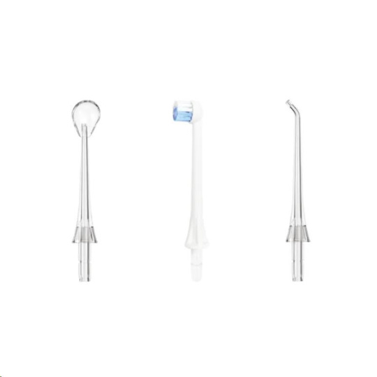 V balení výrobku najdete dvě standardní trysky na čištění zubů, dvě trysky na čištění jazyka a jednu trysku se zubním kartáčkem. Ústní sprchu tak můžete používat se svou láskou, základna zůstává stejná, pouze vyměníte rukojeti trysek. Po 6 měsících používání doporučujeme trysky vyměnit.