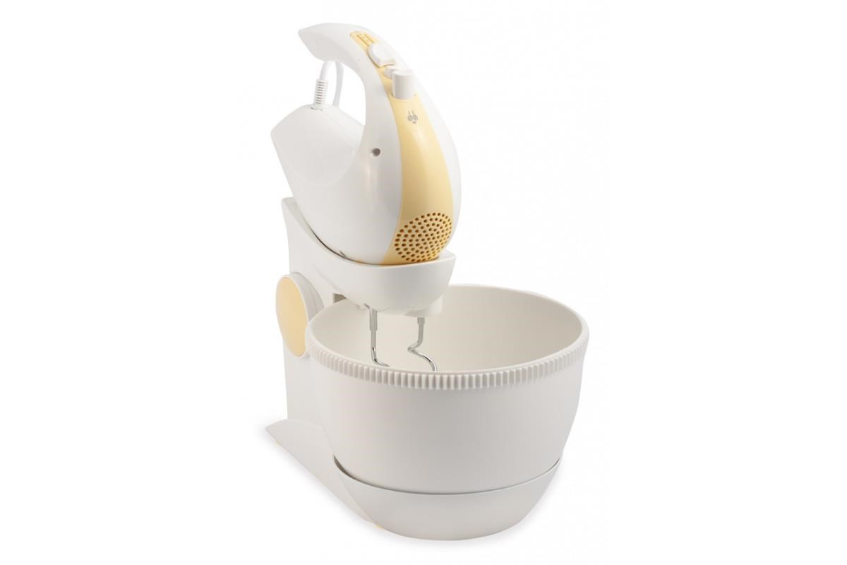 Elektrický ruční šlehač s otočnou nádobou, 5 rychlosti a funkce TURBO pro maximální výkon, 2,5 l otočná nádoba s mechanickým pohonem, Sada šlehacích metel a metel na hnětení, Výklopné rameno, Napájení: 230V~ 50Hz, 300 W.