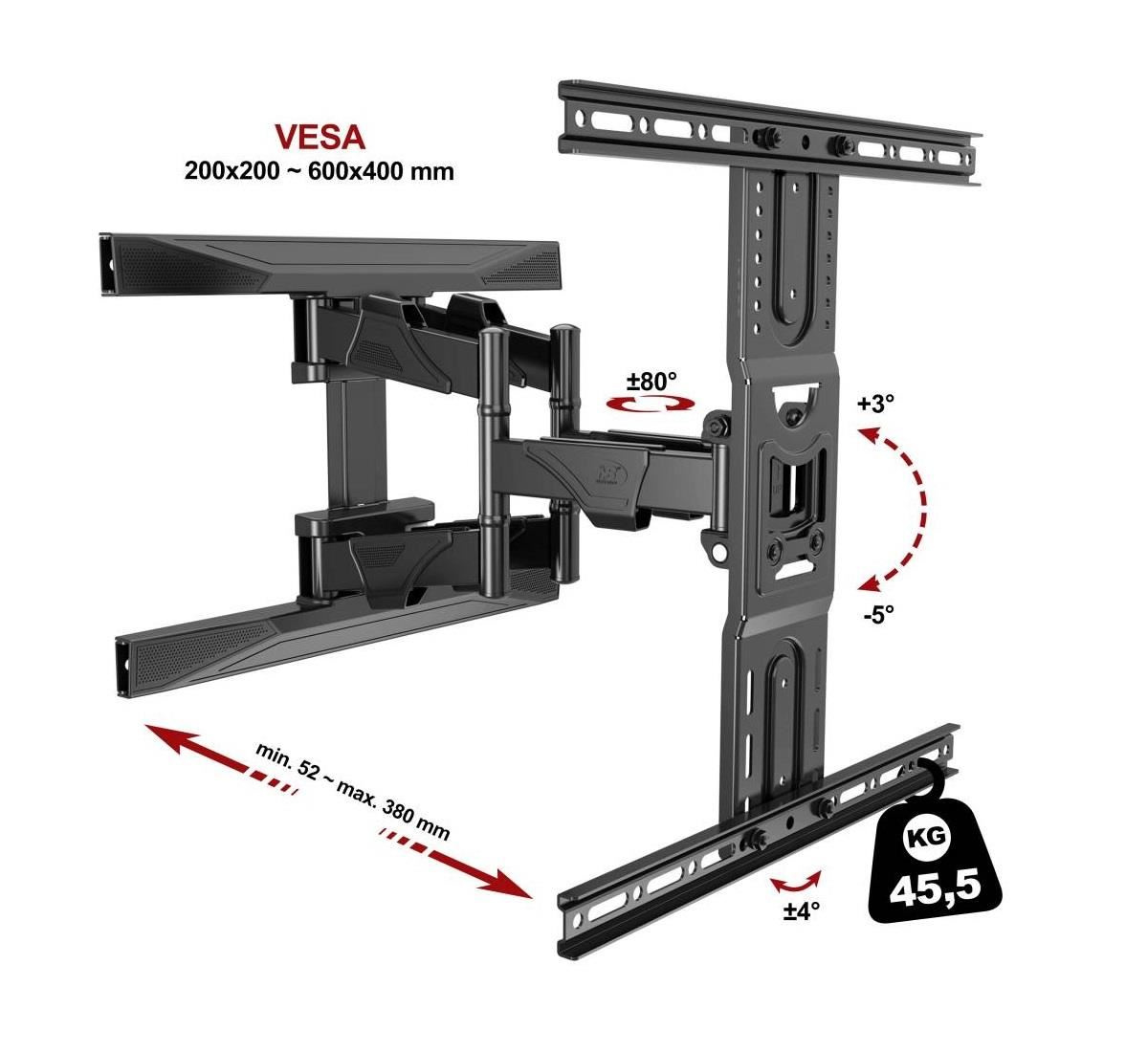 Kvalitní držák na Tv NB DF600-P6 Kvalitní polohovatelný držák na Tv 43" až 75", výsuvný 52-380mm, otáčení do stran +/-60°, naklápění +3°/-5°, VESA 200x200 až 600x400, nosnost 45,5kg Otáčecí držák televize, snadná instalace na stěnu, velmi kvalitní spolehlivá konstrukce. Držák Tv NB DF600-P6 je ideální na televize s hmotností do 45kg a VESA standardy od 200x200 do 600x400, velikost Tv by měla být ideálně v rozmezí 43" až 75". Možnost vysouvání Tv od zdi do vzdálenosti až 38cm a mírného naklápění Tv +3° až -5° a otáčení do stran až +/- 60°. V případě nerovností na zdi je možné rovinu televize upravit +/- 4°. Barevné provedení černé, balení včetně instalačního materiálu, záruka 5 let. Vynikající nástěnný držák pro otáčení televize NB DF600-P6 Technické údaje: nosnost držáku 45,5kg ideální na Tv s úhlopříčkou 43" až 75" podpora VESA standardů 200x200 až 600x400 nastavení vzdálenosti od zdi 52 až 380mm otáčení Tv do stran až +/- 60° možnost naklápění Tv +3° až -5° regulace roviny obrazovky +/- 4° úchytky na kabeláž dizajnové krytky nástěnného úchytu špičková, velmi pevná a spolehlivá konstrukce materiál ocel záruka 5 let Široká škála polohování televize na držáku Tv NB DF600-P6 Držák DF600-P6 podporuje VESA standardy: VESA 100x200 VESA 200x200 VESA 300x200 a 200x300 VESA 300x300 VESA 400x200 a 200x400 VESA 400x300 a 300x400 VESA 400x400 VESA 600x400 Výborný držák se spolehlivou konstrukcí bez vůlí a bezúdržbovým provedením čepů v kloubech držáku. Držák DF600-P6 je vhodný na veškeré televize s hmotností do 45,5kg, které podporují kterýkoli z výše uvedených VESA standardů..