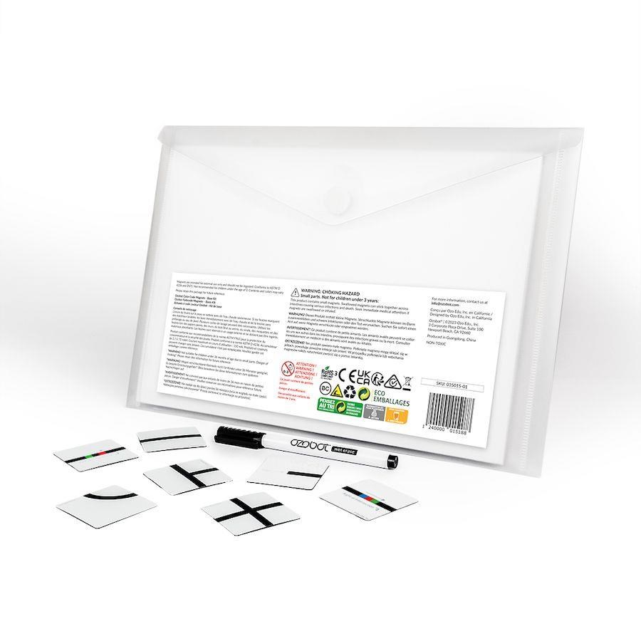 Základní magnetická sada Ozobot je kombinací barevných kódů Ozobot a dílků pro následování trasy pomocí černé linie. Umožňuje žákům rozvíjet zkušenosti v širokém spektru dovedností. Magnety s barevnými kódy a liniemi mají vhodnou velikost a snadno se používají. Manipuluje se s nimi jednoduše díky praktickým rozměrům a jsou ideální pro mladé žáky, kteří právě začínají objevovat svět interaktivního kódování.