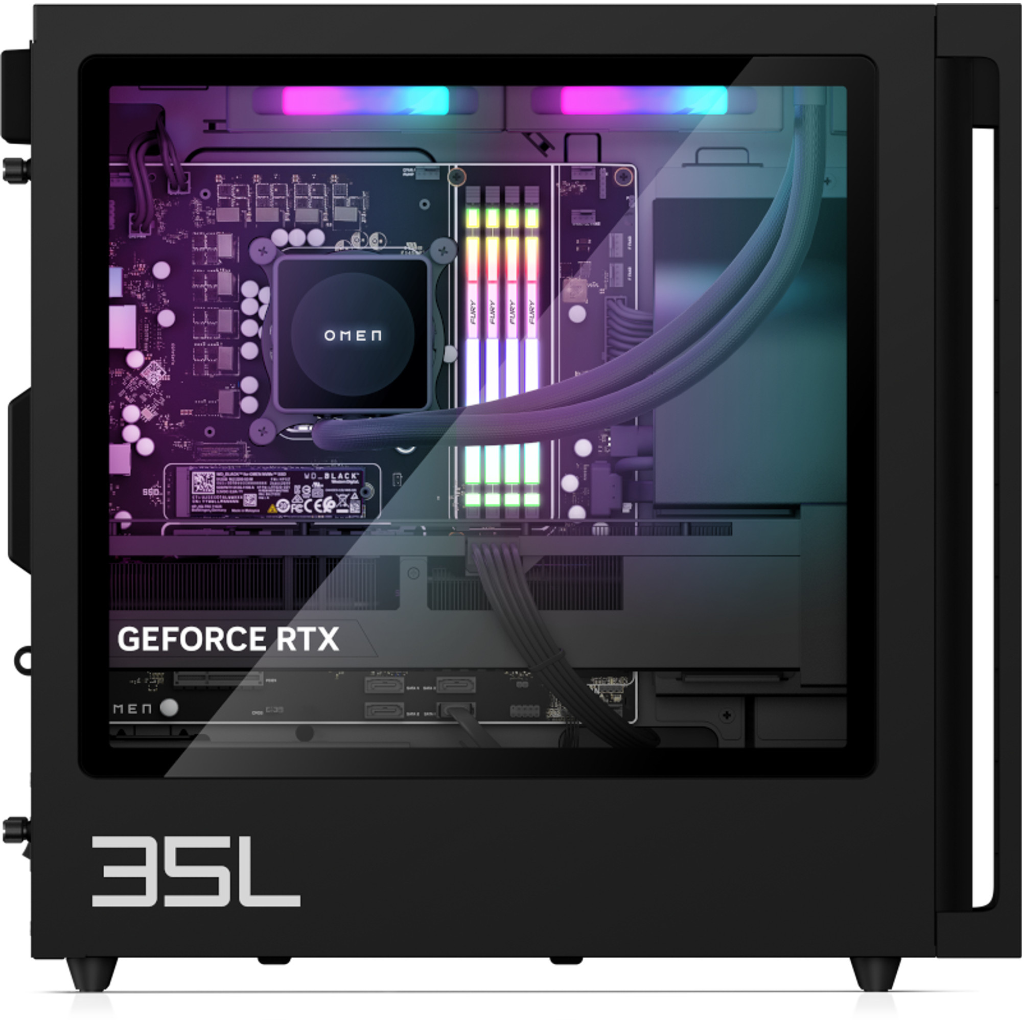 Těš se na špičkový výkon se silným a stylovým herním stolním počítačem OMEN 35L, který lze snadno upgradovat a je osazen vysoce výkonnými komponentami OMEN.