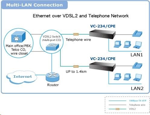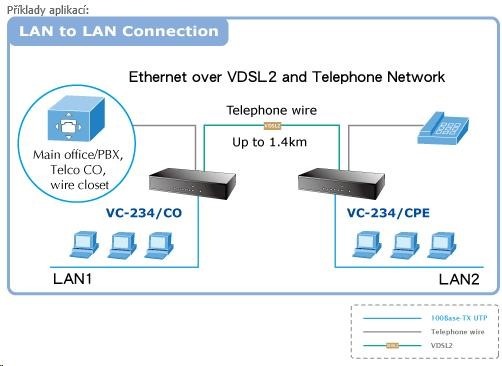 Ethernet po telefonním vedení (technologie VDSL2). 4x LAN RJ-45, 2x RJ-11 konektor pro VDSL2 a POTS. 100/100Mbps na 300m.Transparentní bridge. Dosah až 1,4km. Nastavení DIP přepínači. Volitelně Master (CO) / Slave (CPE). Vestavěný splitter. Výkonný LRE (Long Reach Ethernet) konvertor ethernetu na VDSL2 (Very-high-data-rate Digital Subscriber Line 2) dovoluje přenést data symetrickým párem vodičů rychlostí až 100Mbitů/s na 300m nebo 20/4Mbps do vzdálenosti až 1,4km. Integrovaný splitter zachová hlasovou službu na telefonním vedení bez další úpravy zapojení, datový provoz se jednoduše přidruží k existujícímu hlasovému. S výhodou tak lze využít telefonní kabelová vedení původně určená pro spojení nejenom k účastníkům ale i mezi analogovými ústřednami. ISP (internet service provider) je tak umožněno nabízet multimediální služby, VOD (video on demand), VoIP (voice over IP), Video phone, IPTV, apod. Zařízení je univerzální jako master (CO) / slave (CPE) jednotka, nastavení režimu přepínačem. Jednotka podporuje VDSL2 operační módy "17a" a "30a" a také "band Plan997" postihující symetrický přenos dat vyšší rychlostí. Vlastnosti: - 2x port RJ-11 pro VDSL a POTS (Plain Old Telephone Service) - 4x LAN 10/100Base-TX, Switching, Full Duplex (100/200 Mbps), Auto-Negotiation (10/100 Mbps) - transparentní pro IEEE 802.1Q VLAN tag - parametry nastavované DIP přepínači na zařízení: volba CPE/CO, volba modulace, volba komunikačního limitu, volba SNR - podpora standardů: IEEE 802.3, 10Base-T, IEEE 802.3u, 100Base-TX, IEEE 802.3x - splňuje VDSL standardy ITU-T G.993.1, ITU-T G.997.1, ITU-T G.993.2 - rozměry: 155 x 86 x 26mm - hmotnost: 368g - externí zdroj 5V/2A - provozní teplota okolí: 0 až 50°C Dosahy a rychlosti na vedení s vodiči AWG24 a lepších: > 17a profile (Downstream / Upstream) - 200m -> 99/70Mbps - 400m -> 99/60Mbps - 600m -> 90/45Mbps - 800m -> 50/28Mbps - 1000m -> 40/12Mbps - 1200m -> 20/7Mbps - 1400m -> 20/4Mbps > 30a profile (Downstream / Upstream) - 300m -> 100/100Mbps - 400m -> 90/90Mbps - 600m -> 69/55Mbps - 800m -> 48/9Mbps.