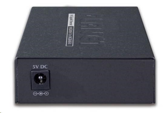 Jednoduchý media konvertor vybavený metalickým RJ-45 konektorem s rychlostí 100/1000/2,5G/5G/10G a optickým SFP+ portem s rychlostí až 10GBASE. Použití je vhodné v sítích, kde je vyžadována extrémně vysoká šířka pásma, jako jsou například data centra, cloudová úložiště, nebo infrastruktura operátorů. Díky spolehlivosti je zaručena vysoká přenosová rychlost bez rizika ztráty paketů při extrémní rychlosti. Samozřejmostí je ochrana až 6 KV DC ESD. Další výhodou je nízká spotřeba 3,75 W při plné zátěži. ZÁKLADNÍ SPECIFIKACE Fyzické vlastnosti: Porty: 1 x RJ-45 100/1000/2,5G/5G/10GBASE-T, 1 x SFP+ 10GBASE-XR Podpora přenosu: JumboFrame 16K Propustnost: sběrnice 20 Gbps, provozně 2,48 Mpps (64B) Tabulka záznamů: 9K MAC adres Provedení: vnitřní Napájení: zdroj 5V DC, 2A max., celkový příkon do 3,75 W Ochrana: ESD 6 KV DC Provozní teplota: 0 až 50°C Rozměry: 94 x 70 x 26 mm Hmotnost: 180 g.