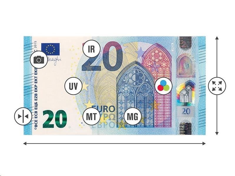 - 7-bodová detekce padělků: prvky viditelné v ultrafialovém světle, magnetický inkoust, kovový proužek, infračervené vlastnosti, obraz, velikost a tloušťka