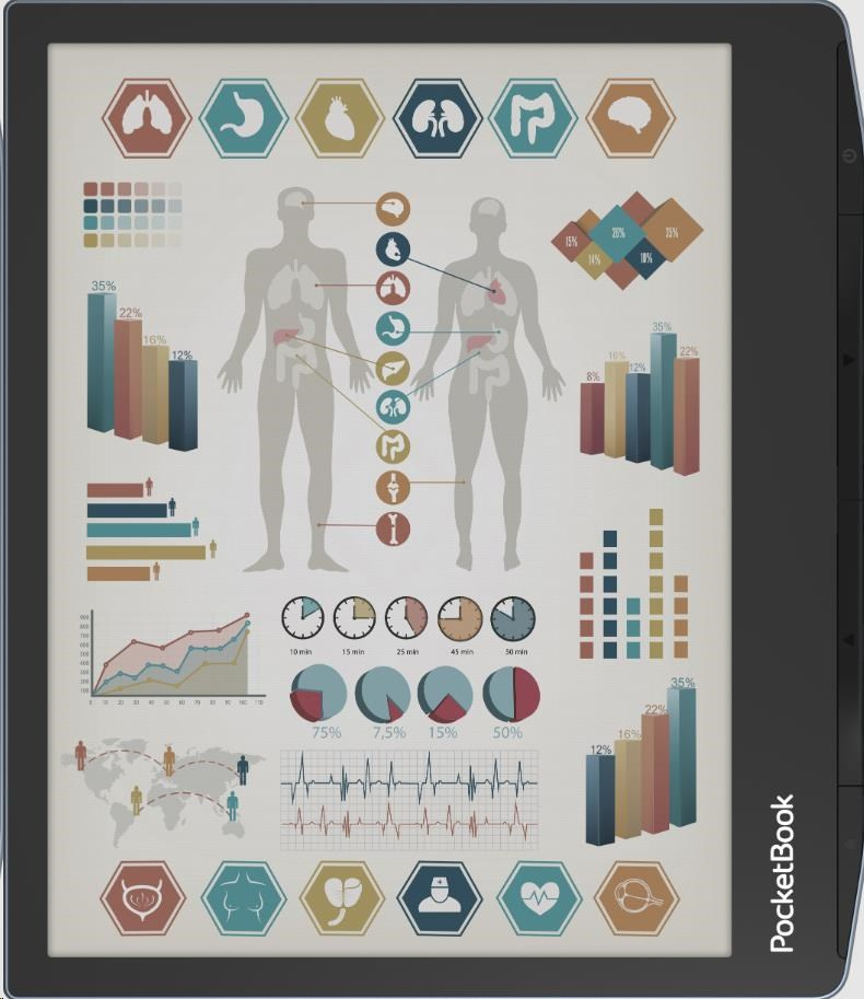 7“ barevná obrazovka, bezpečná pro oči a založená na nejnovější technologii E Ink Kaleido™ 3. O 50 % vyšší rozlišení barevných e-stránek a PPI.