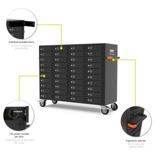 Tento cabinet dokáže nabíjet, bezpečně ukládat a spravovat až 40 tabletů, notebooků, mobilních telefonů a dalších elektronických zařízení.