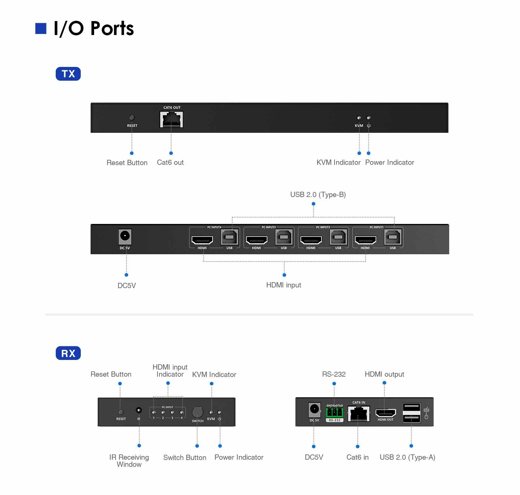 - Volba serveru /PC za pomoci tlačítka na čele receiveru nebo dálkovým ovladačem nebo pomocí RS232