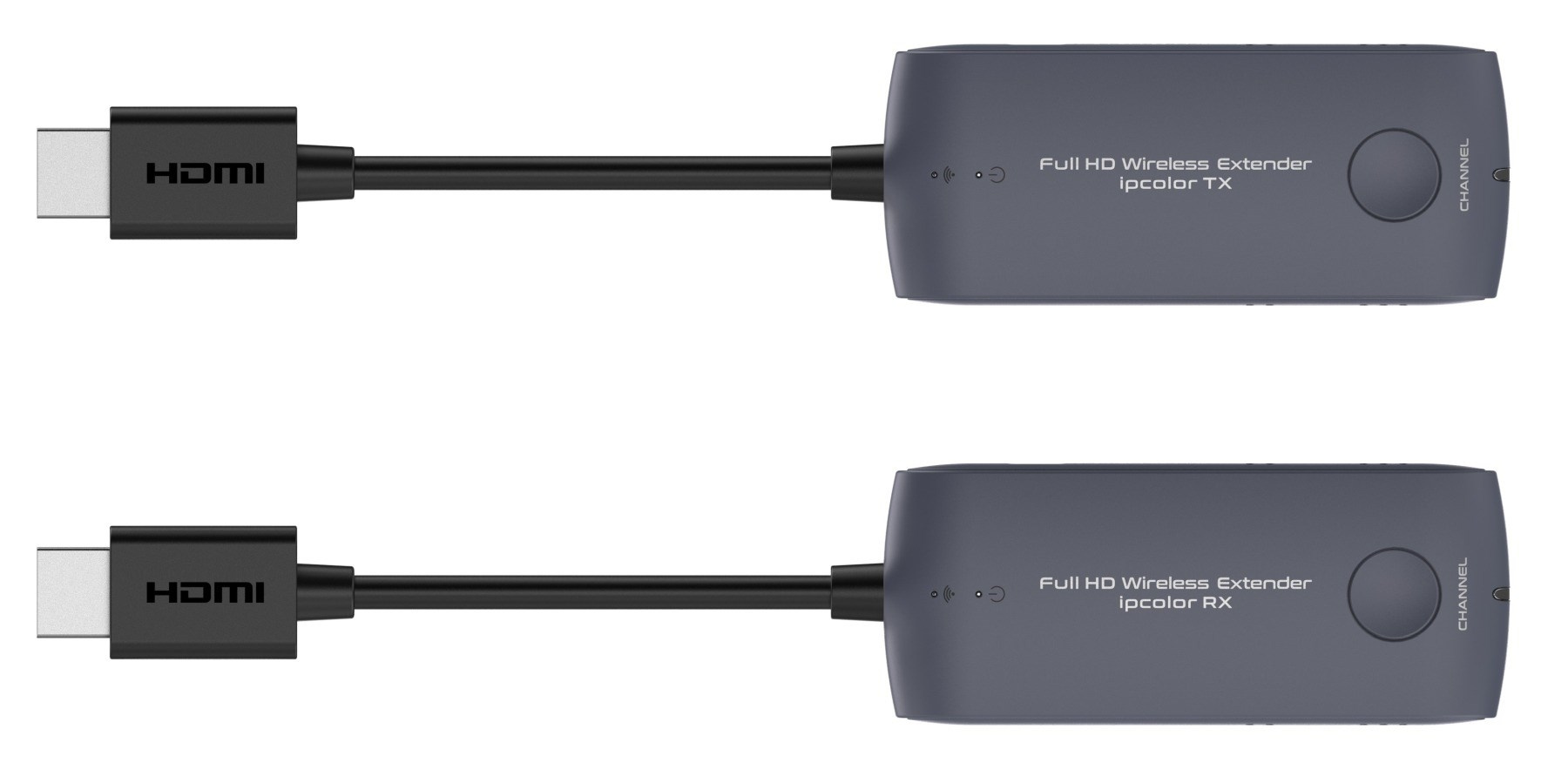 - Vysílací a přijímací adaptéry mají krátký HDMI kabel pro snadné zapojení do počítače a zobrazovače nebo TV.