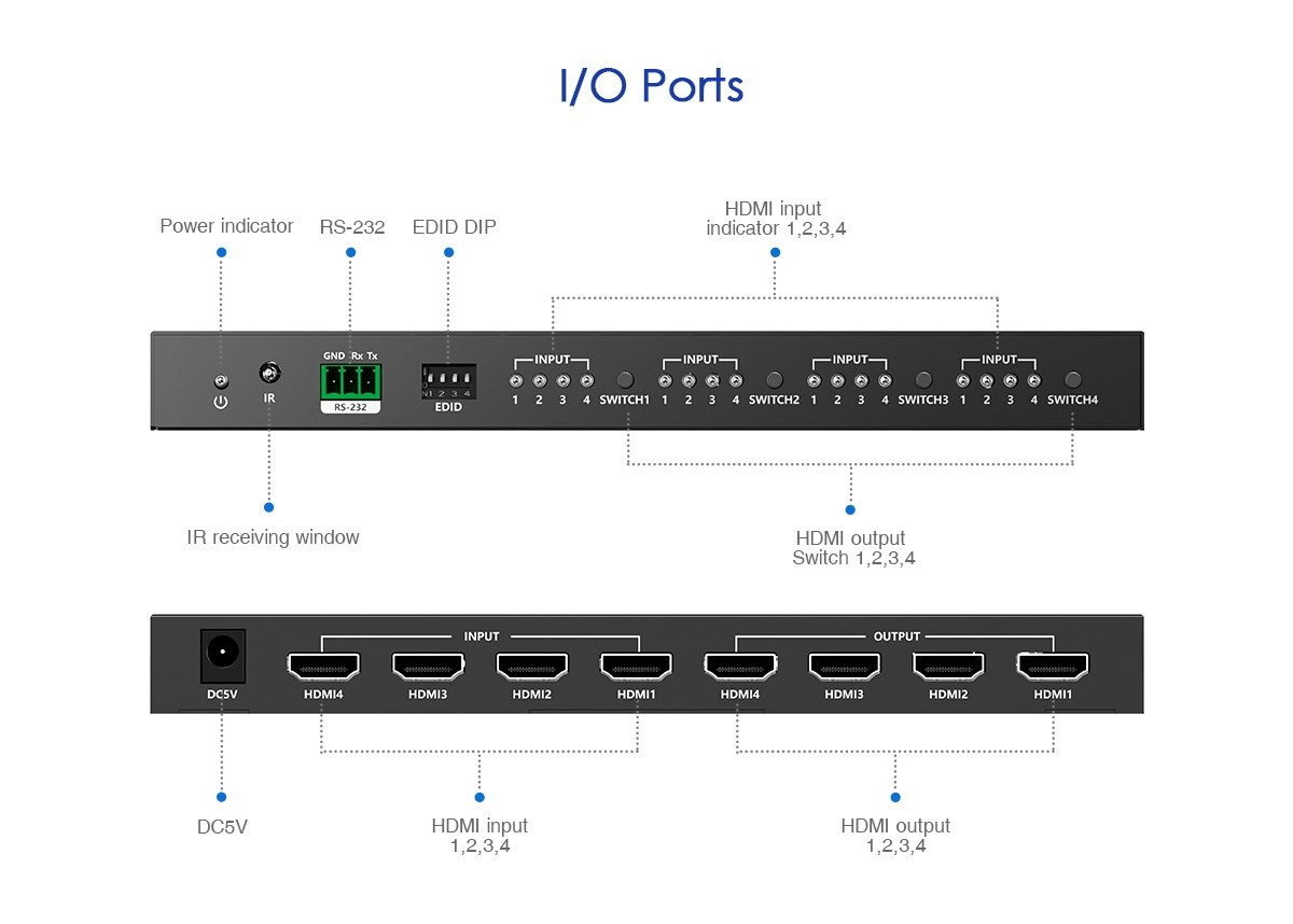 Ovládání pomocí dálkového ovladače nebo čtyřmi tlačítky na předním panelu přepínači, je možné nastavit libovolný vstup na jeden ze čtyř výstupů. Přepnutí je ihned signalizováno LED diodami, které představují číslo vstupu, který je aktuálně přepnut na výstup.