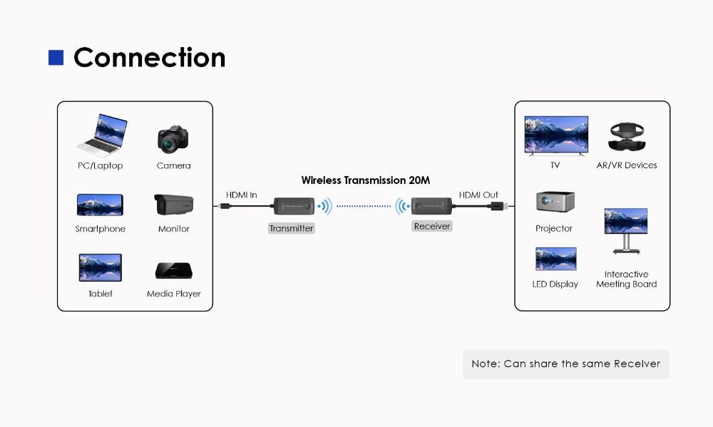 - Poporuje bezdrátový přenos rozlišení 4K@60Hz a Full HD 1080p na vzdálenost až 20m