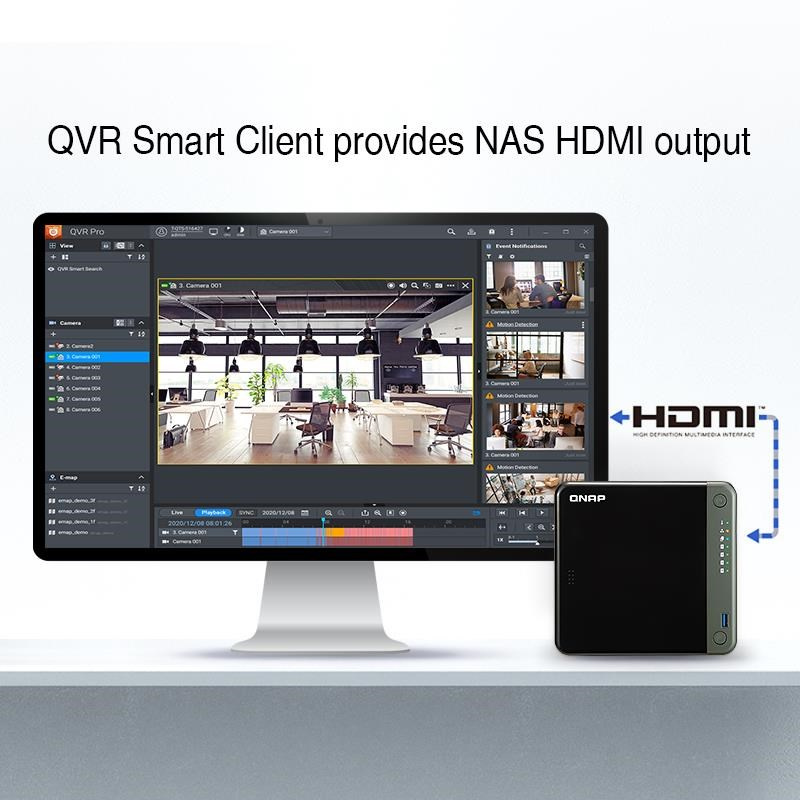 QVR Smart Client umožňuje uživatelům NAS s výstupem HDMI přímo sledovat dozorovací záběry připojením NAS k displeji HDMI. Nejsou potřeba žádné samostatné počítače. Lze také použít Smart Search v QVR Smart Client a snadno zobrazit výsledky hledání na časové ose.