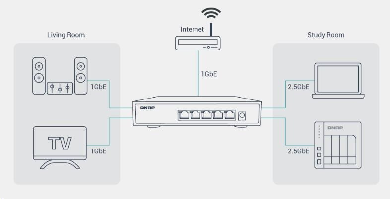 S pěti porty 2,5GbE switch QNAP QSW-1105-5T okamžitě upgraduje vaši síť tak, aby mohla využívat výhody zařízení podporujících 2,5GbE a NAS, aniž by byly nutné jakékoli nové síťové kabely. Zařízení QSW-1105-5T nabízí téměř tiché provedení bez ventilátoru a zapojení typu plug-and-play. Funkce detekce a blokování síťové smyčky umožňuje snadné vytvoření dostupného vysokorychlostního síťového prostředí pro váš domov nebo podnik.