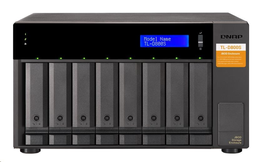 Úložná jednotka JBOD TL-D800S vám umožňuje zálohovat a rozšířit vaše zařízení QNAP NAS, počítače se systémem Windows® a Ubuntu® a servery. Zařízení TL-D800S má osm 3,5" pozic pro diskové jednotky SATA 6Gb/s a dodává se s kartou QXP PCIe pro připojení jednotky pomocí kabelu SFF-8088 (nebo SFF-8644). Poskytuje spolehlivý výkon při čtení a zápisu pro plynulé ukládání a zálohování.